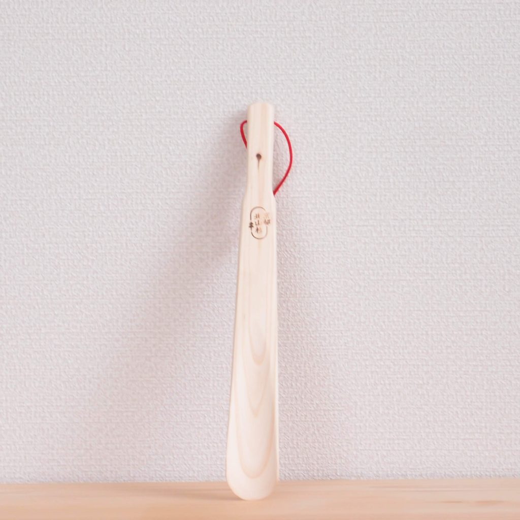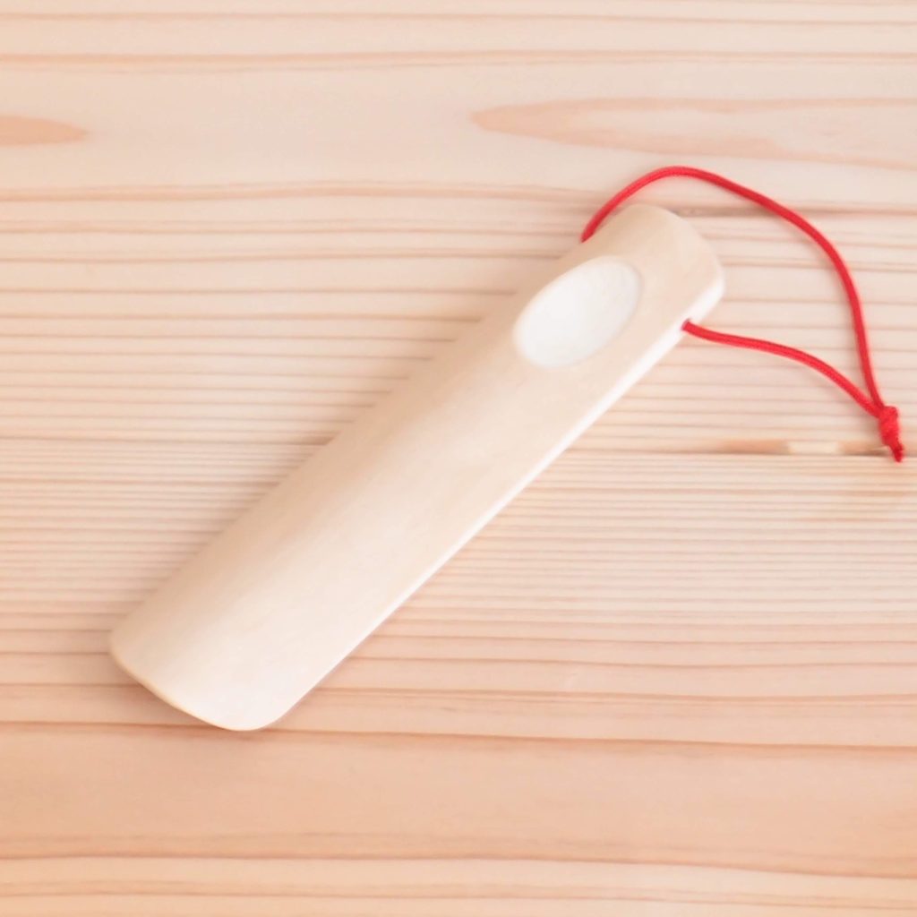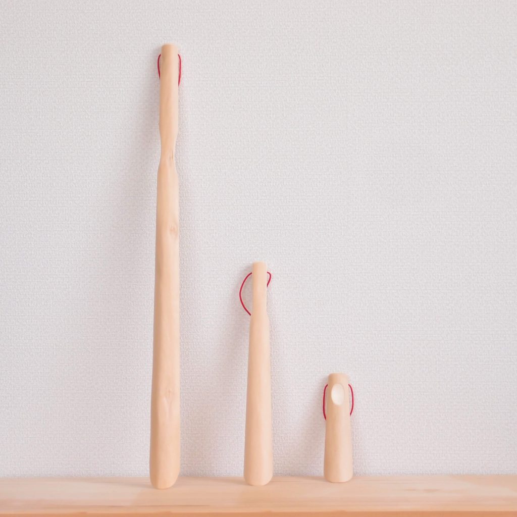 それぞれの靴べらには持ちやすいようにくぼみをつけて、また紐を通してフックなどにかけれるようにしています。
