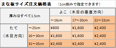 手順① 下の価格表でお好きなまな板のサイズに該当する値段をご確認ください。
